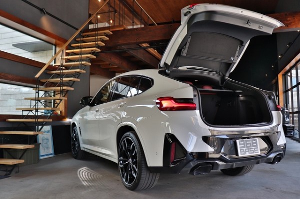 大人気のアルピンホワイトのボディカラーに専用装備が迫力あるスタイルをより一層際立たせ、カーボンドアミラーカバー、テールゲートカーボンリップスポイラー、オプション21インチホイール付きでスタイリッシュな『X4 M40i』