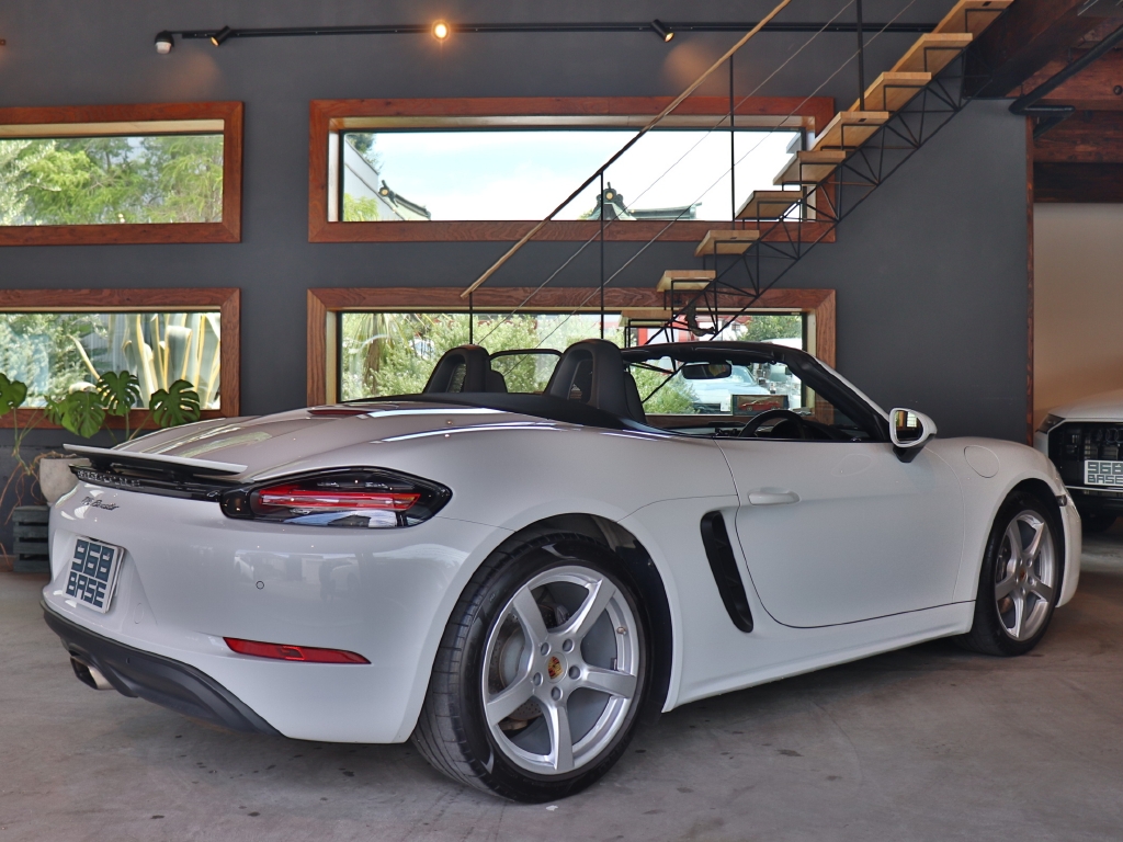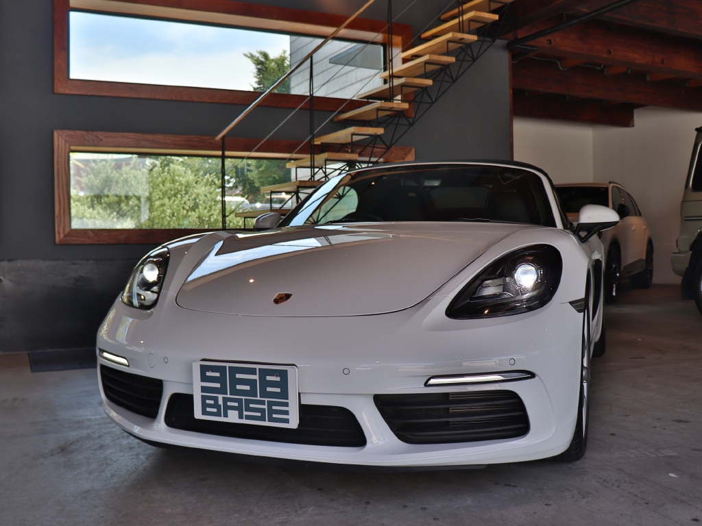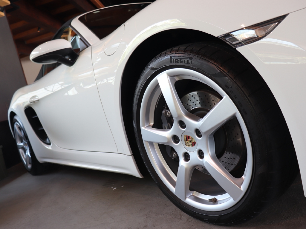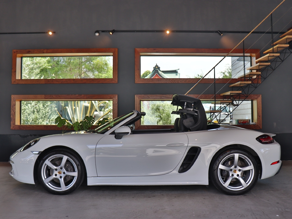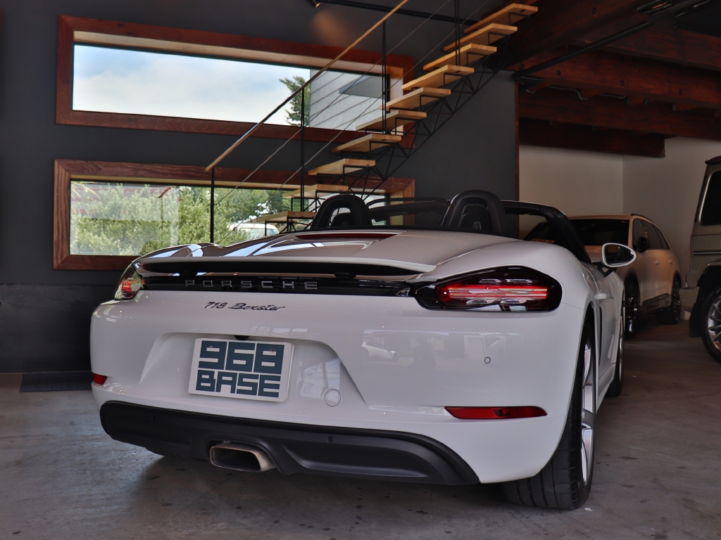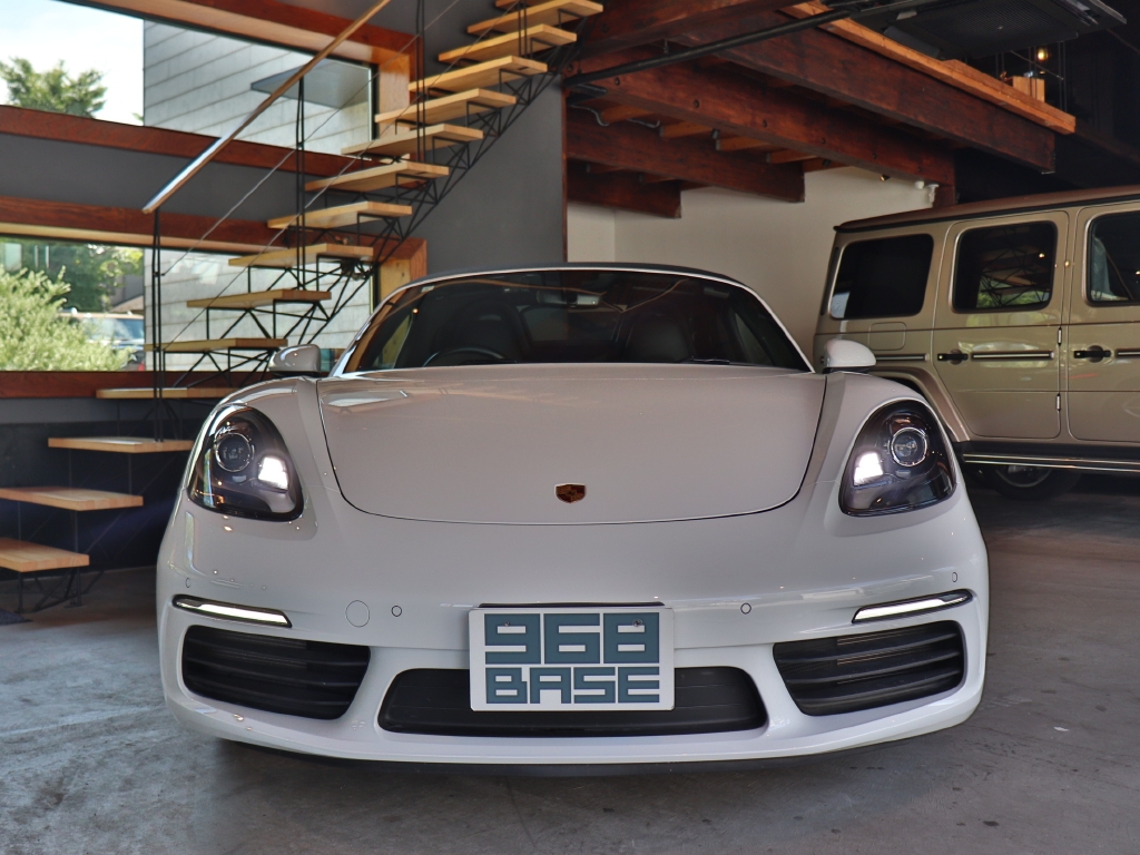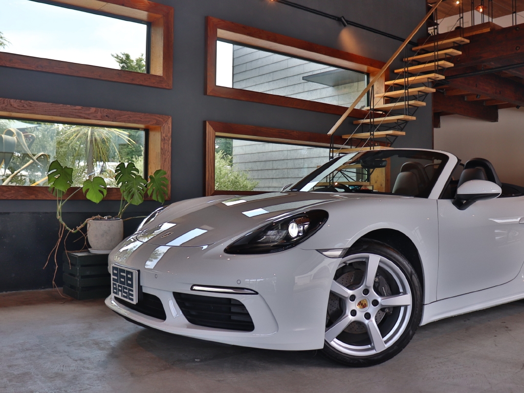大人気のホワイトのボディカラーにブラックソフトトップを組み合わせ、カラークレストセンターキャップ、純正オプション19インチアルミ装着でスタイリッシュな『718ボクスター 2.0PDK』
