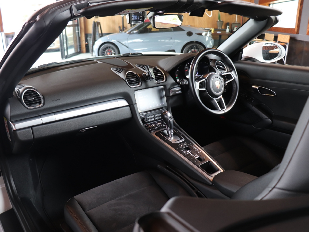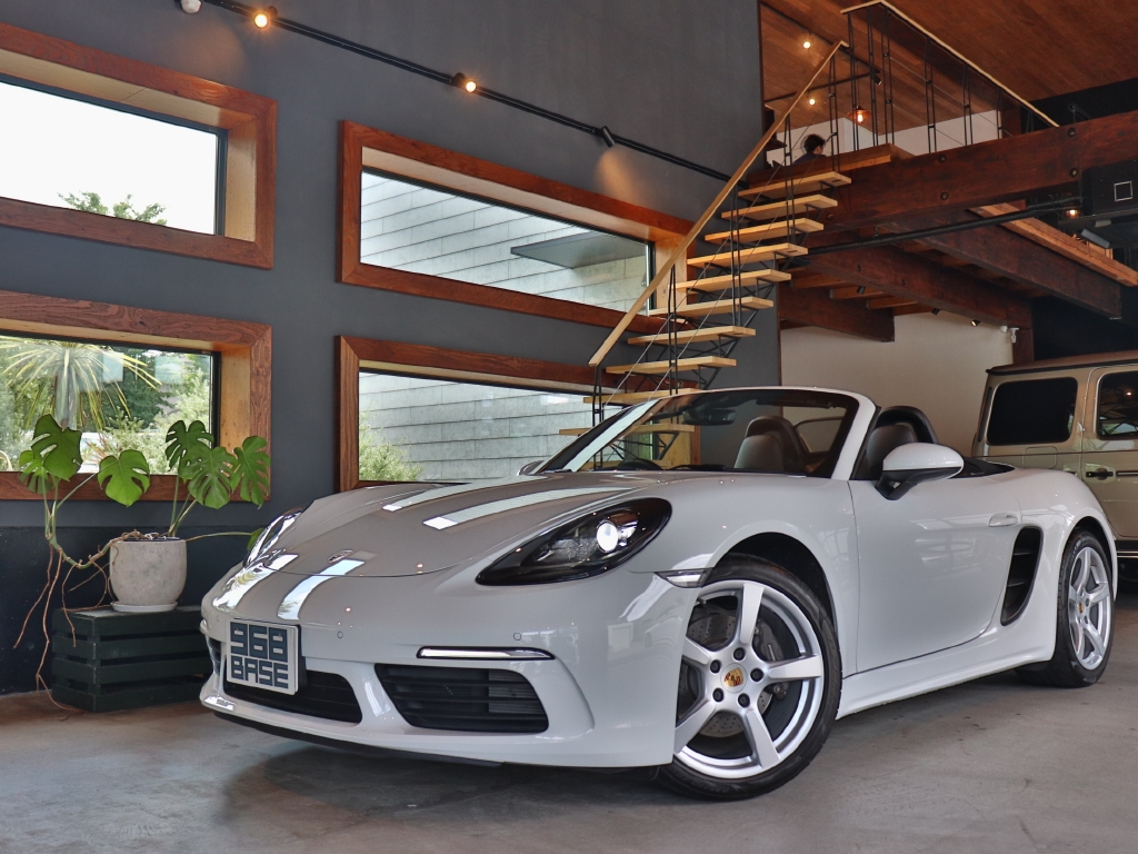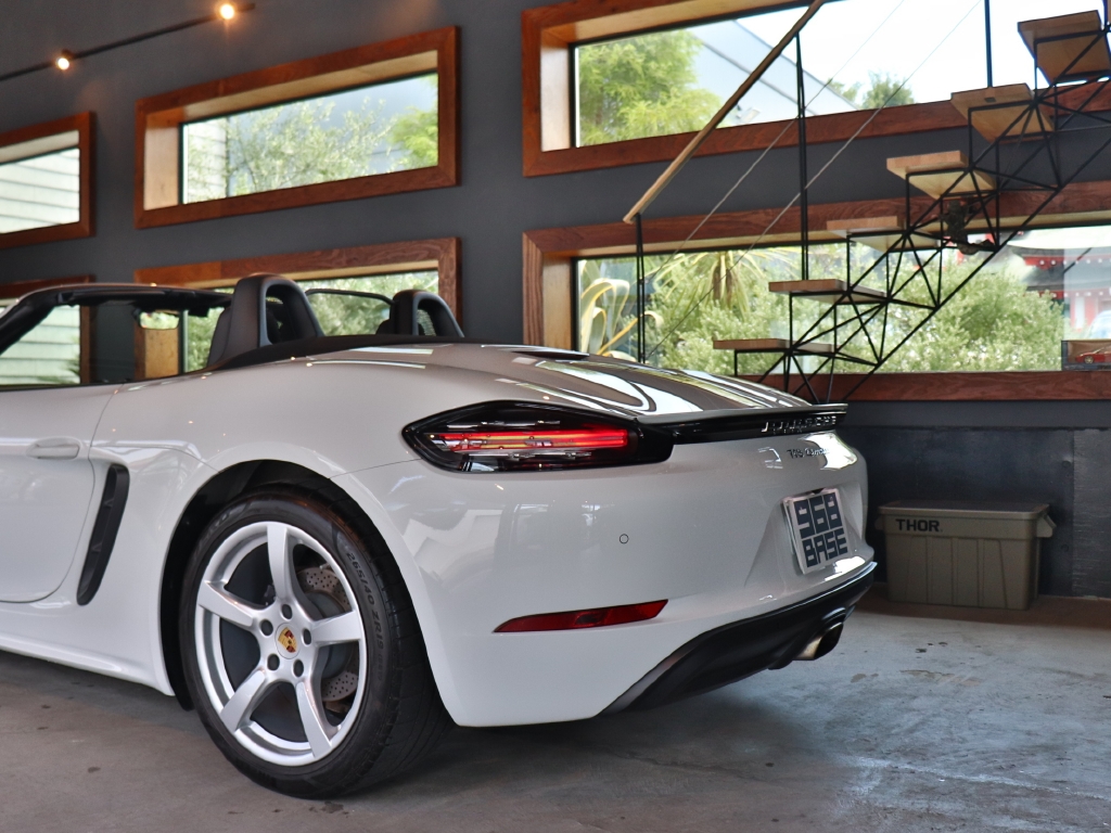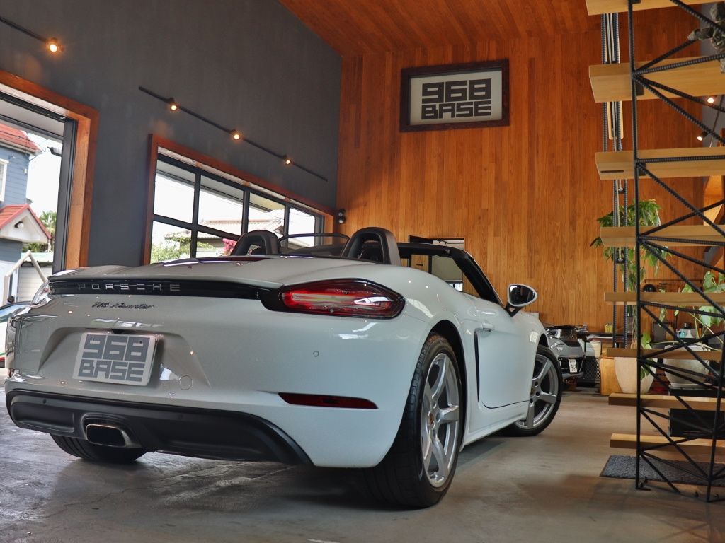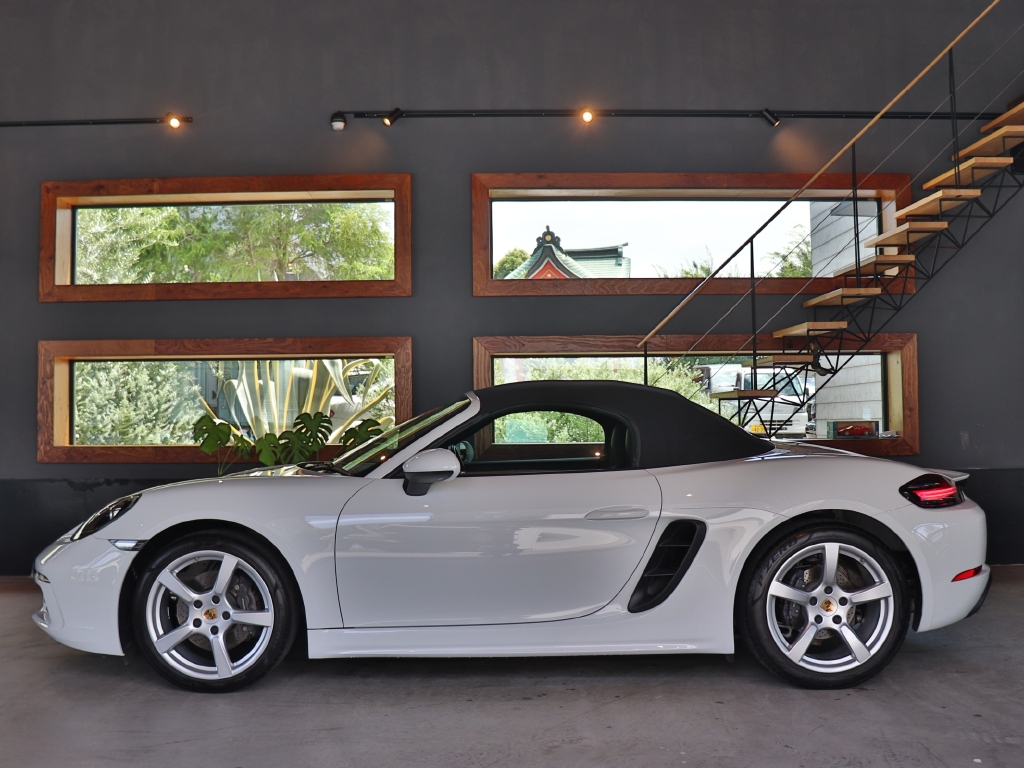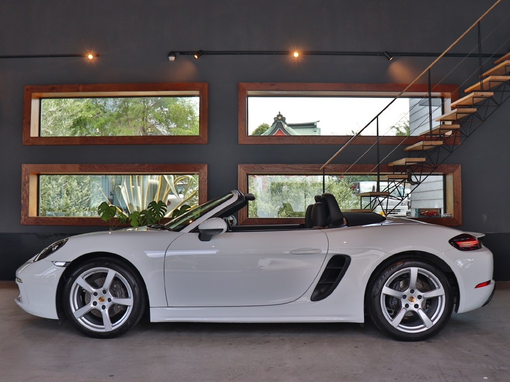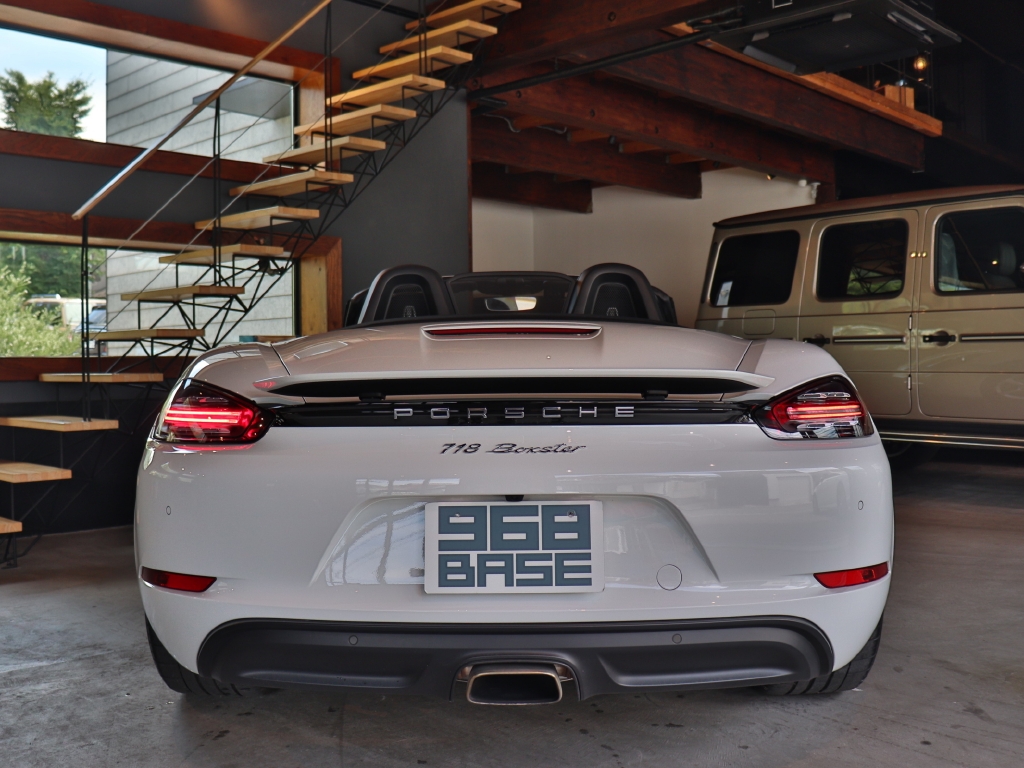 大人気のホワイトのボディカラーにブラックソフトトップを組み合わせ、カラークレストセンターキャップ、純正オプション19インチアルミ装着でスタイリッシュな『718ボクスター 2.0PDK』