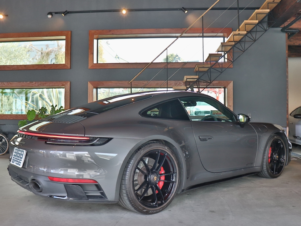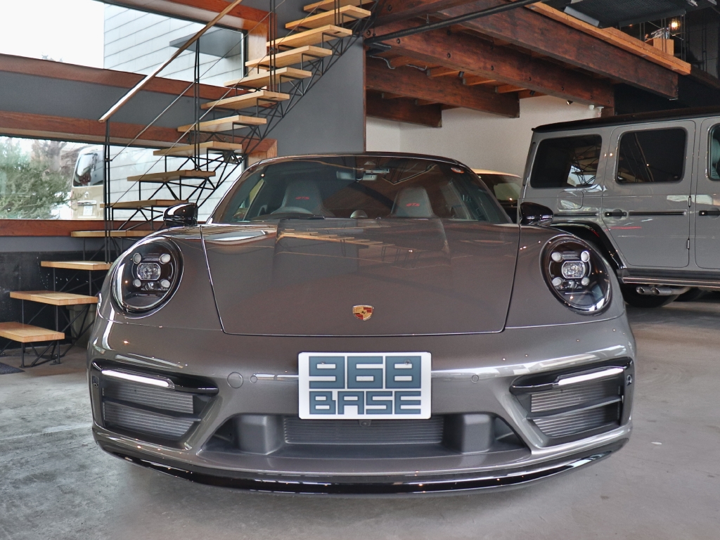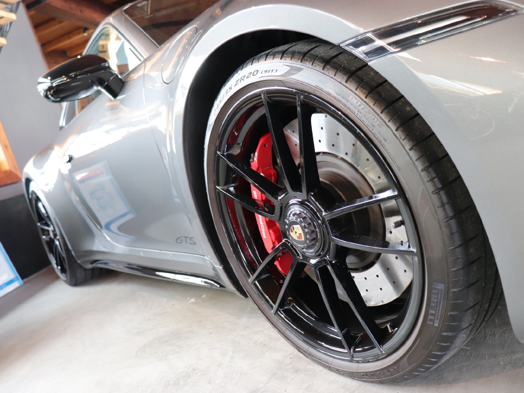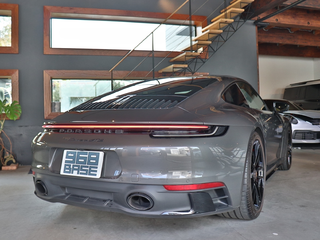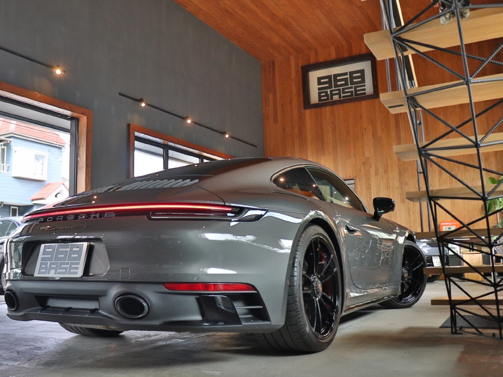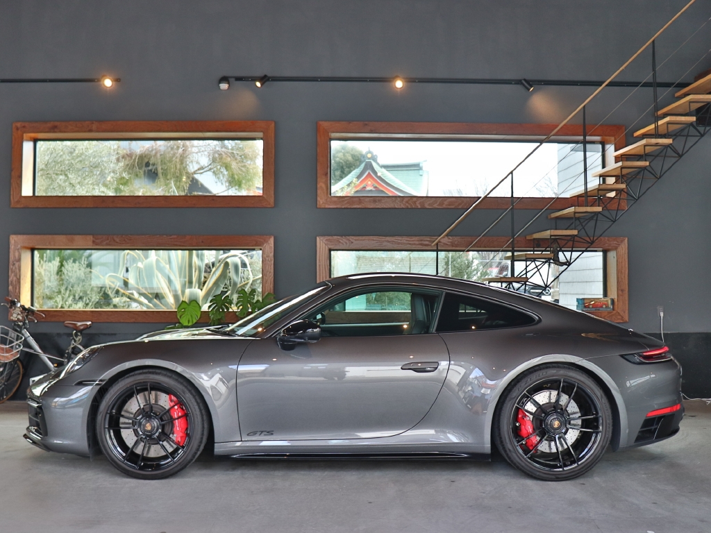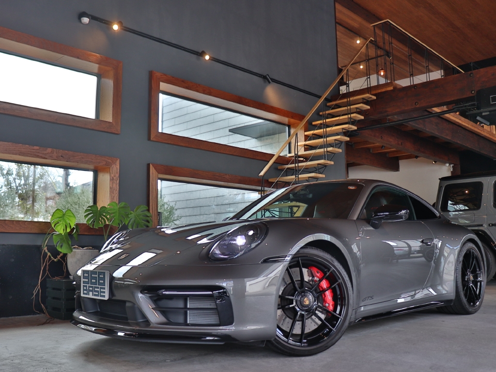 オプションカラーのアゲートグレーメタリックのボディカラーにハイグロスブラックエクステリアパッケージ、GTSインテリアパッケージ、エクステンデッドマットカーボンインテリアパッケージ、Race-Texルーフライニング等の組み合わせでスタイリッシュにきまってます。