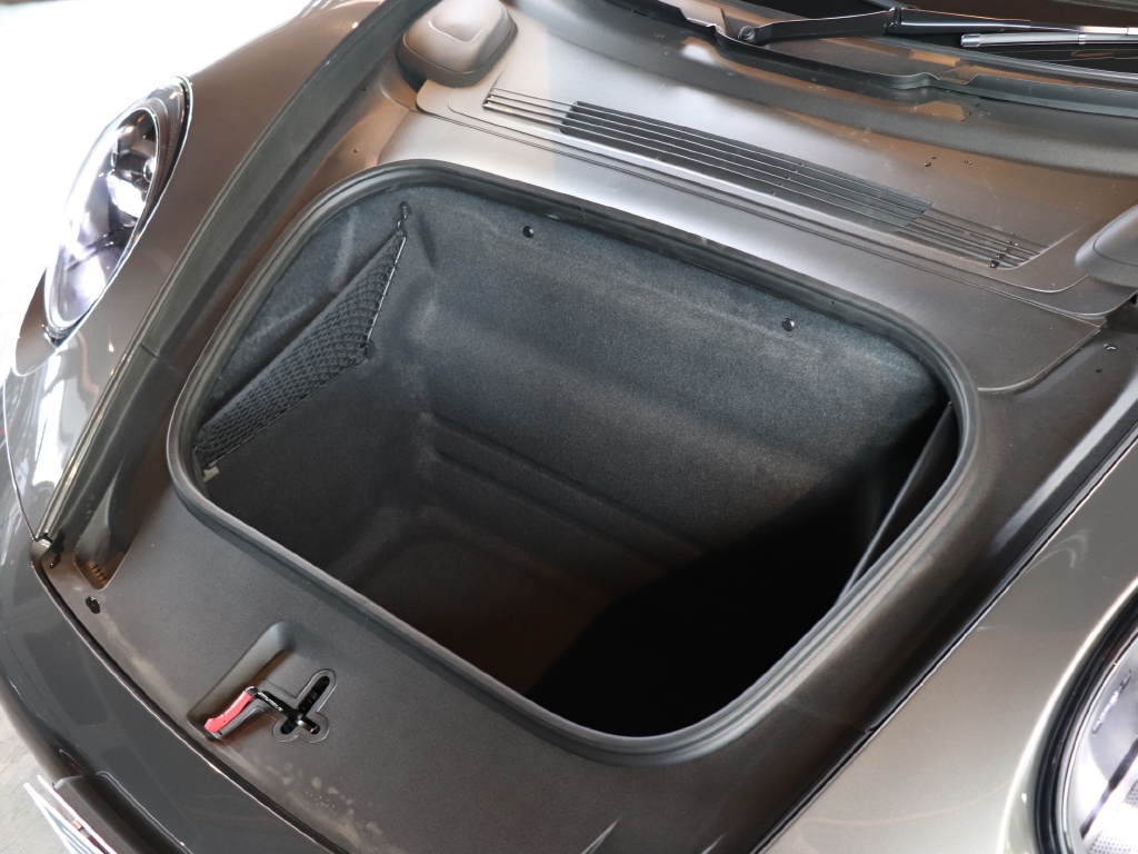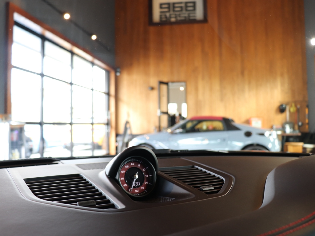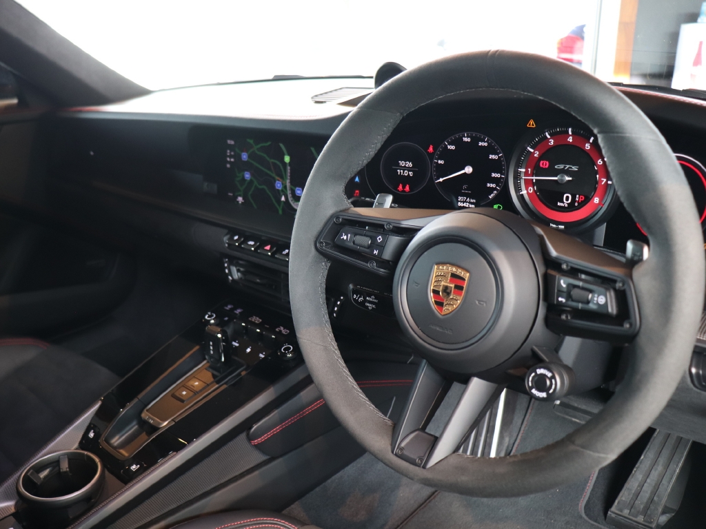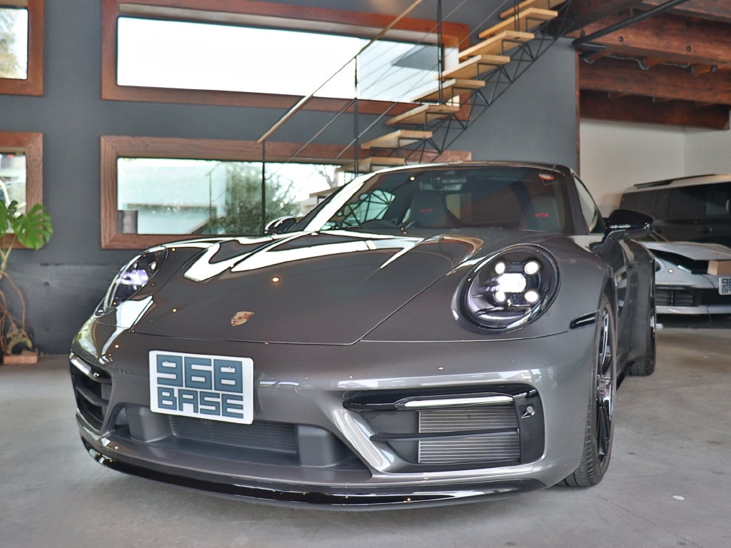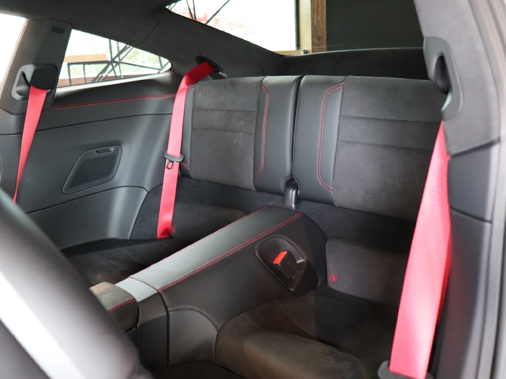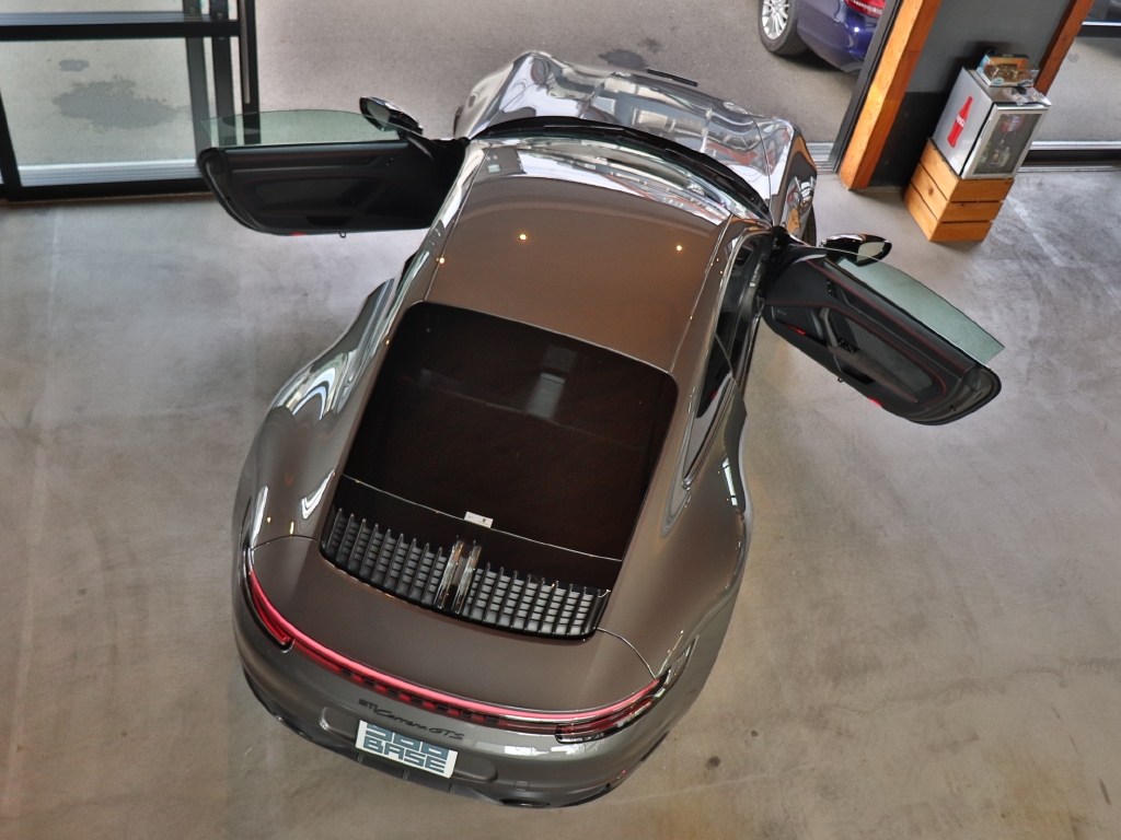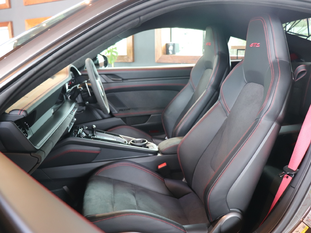 オプションカラーのアゲートグレーメタリックのボディカラーにハイグロスブラックエクステリアパッケージ、GTSインテリアパッケージ、エクステンデッドマットカーボンインテリアパッケージ、Race-Texルーフライニング等の組み合わせでスタイリッシュにきまってます。