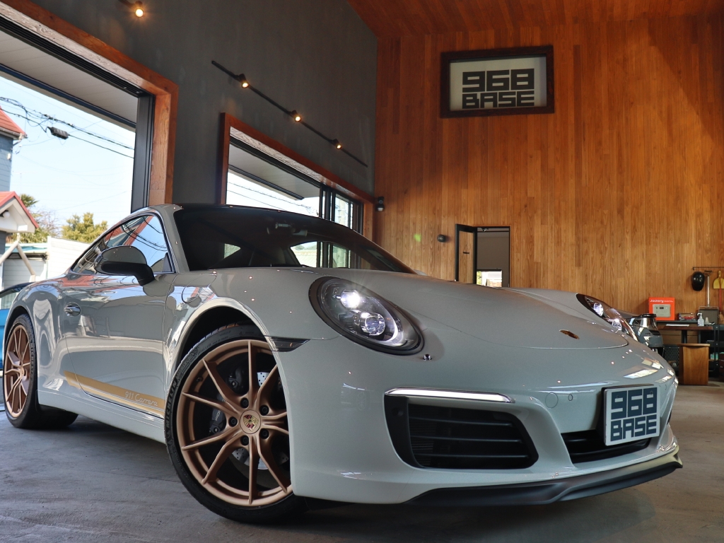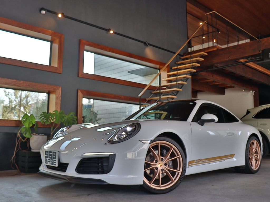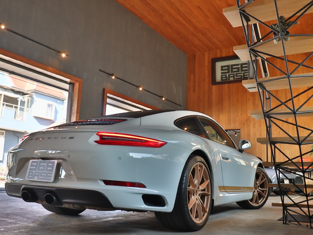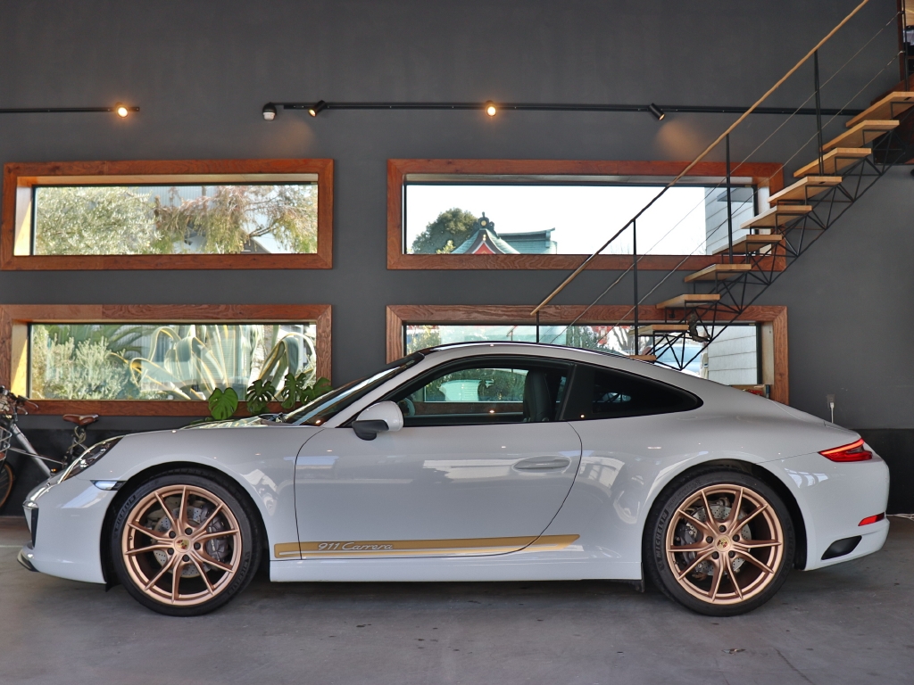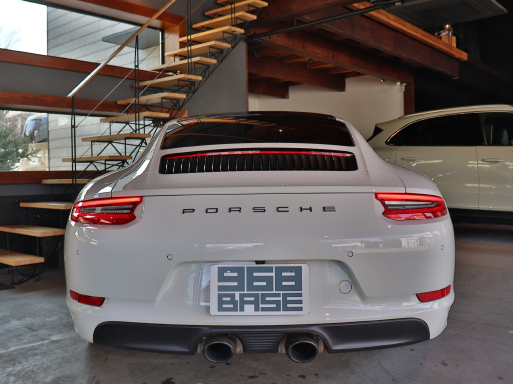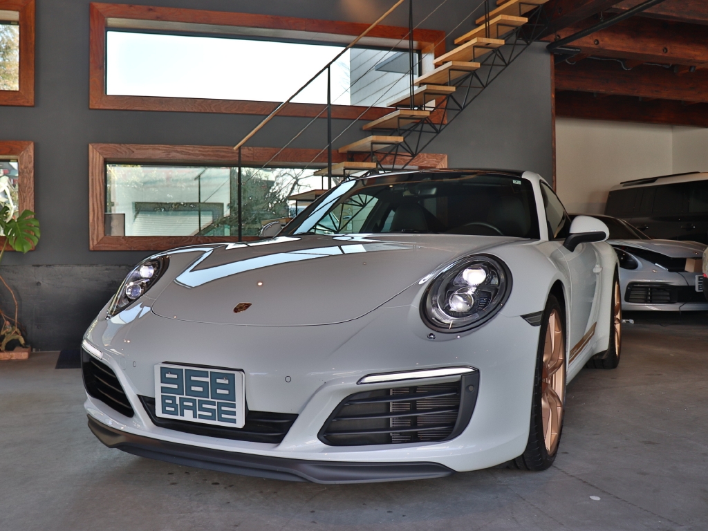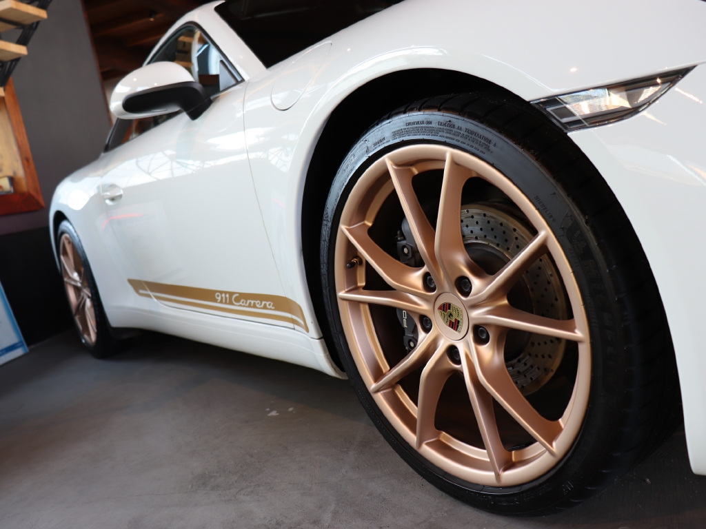 ホワイトのボディカラーに、グロスブラックのルーフラッピング、PDLS+付きLEDヘッドランプ、ワンオフで作成したサイドのゴールドデカール、カレラSの20インチホイールをゴールドに塗装、更には可変バルブ付きSOULマフラー(純正マフラー有り)装着など、魅力が満載の1台!